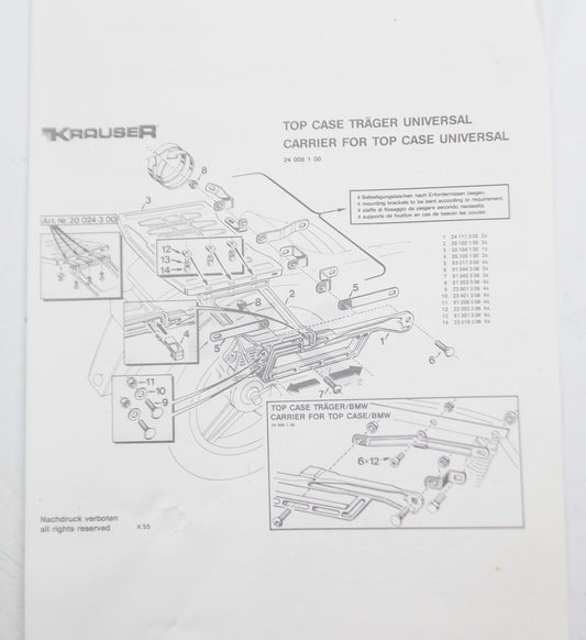 KRAUSER TOP CASE UNIVERSAL HARDWARE MOUNT KIT BOLT WASHER STRAP BMW 18002300